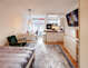 Cucina aperta verso l'area soggiorno divisa otticamente da un bancone, con finestra, piastra ad induzione, forno con microonde integrato, sistema per cottura a vapore, frigorifero con congelatore, lavastoviglie, bollitore elettrico, tostapane, completo di piatti
