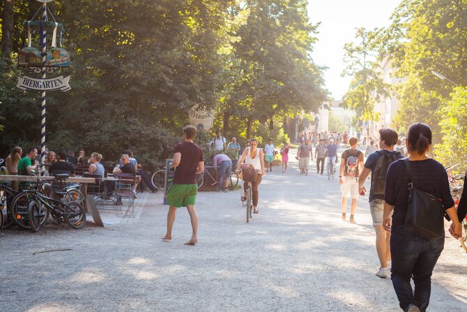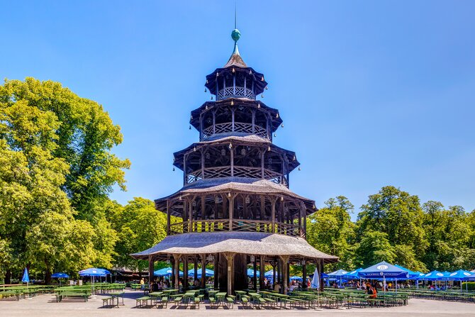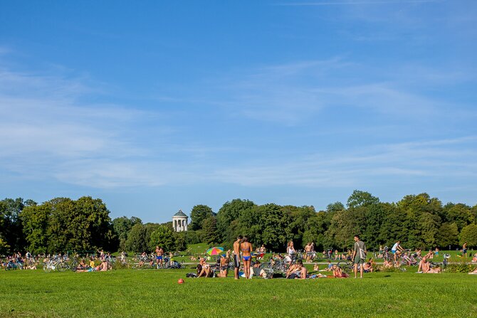 Storia: Nel 1789 - la rivoluzione era in pieno svolgimento in Francia - l'elettore Karl Theodor fece creare a Friedrich Ludwig Schell un parco pubblico nelle pianure alluvionali dell'Isar per alleviare la sua impopolarità presso la popolazione. La gente era entusiasta dell'ampio parco - oggi il più grande parco cittadino del mondo con circa 4 chilometri quadrati - in stile inglese, che ha rinunciato alle piante decorative e potature e imita la vegetazione naturale. Il giardino: corridori, cavalieri, ciclisti, carrozzine, cani, amanti e studenti si sono impossessati del giardino dalla mattina alla sera. Soprattutto nelle belle giornate la vita inonda la parte meridionale del giardino: gli amanti del sole si mettono a proprio agio sui prati intorno all'Eisbach o fanno un breve bagno per rinfrescarsi, mentre nel sud i surfisti si esercitano su e nell'acqua fredda. Il trambusto vivace di musicisti, gelatieri, giocatori di palla o frisbee, ballerini di capoeira o giocolieri può essere osservato a piedi, in carrozza o su un risciò. Colpisce il piccolo tempio rotondo Monopterus. Più a nord, si può gustare una birra con i turisti e la gente del posto mentre si ascolta la musica della banda di ottoni alla Torre cinese. La parte settentrionale del Giardino Inglese è più tranquilla. Se volete fare una passeggiata in pace o semplicemente distendervi nel prato, questo è il posto migliore per voi.