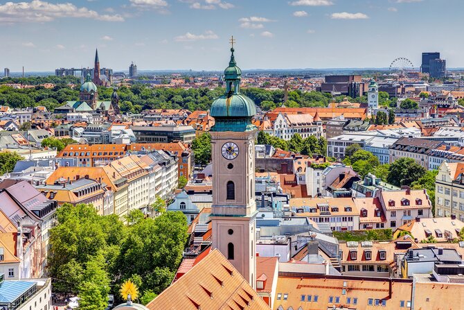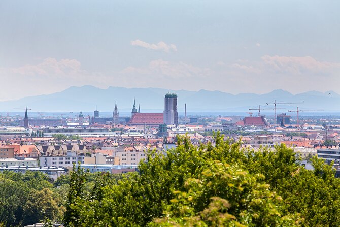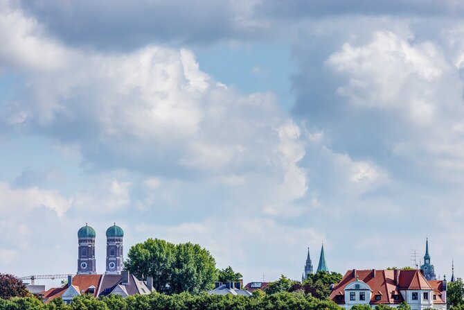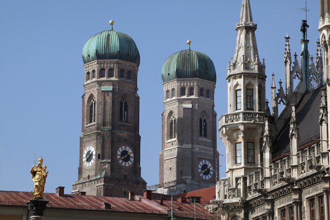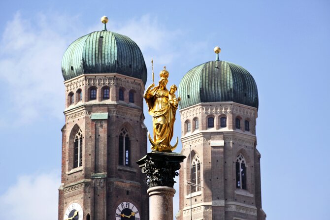 Chiesa Cattedrale di Nostra Signora. L'edificio tardo gotico in mattoni con le sue torri alte quasi 100 metri, costruito tra il 1468 e il 1488 da Jörg von Hasbach, è l'inconfondibile punto di riferimento di Monaco. Il suo possente tetto a capanna troneggia sopra tutte le altre case del centro storico. Gravemente danneggiata e saccheggiata durante la guerra del 1944, la cattedrale è stata ristrutturata in più fasi. Dalla torre sud, aperta al pubblico, si gode una magnifica vista sulla città, situata in primo piano sulle Alpi. All'interno della chiesa si trovano molti preziosi tesori d'arte, come le finestre del coro della fine del XIV secolo, che provengono ancora dalla chiesa precedente, le figure di apostoli e profeti di Erasmus Grasser o i rilievi dorati con scene della vita di Maria di Ignaz Günther del XVIII secolo. Nella cripta principesca sotto il coro ci sono le tombe più antiche della dinastia Wittelsbach, tra cui l'imperatore Ludovico il Bavarese. Secondo una leggenda, il diavolo chiese che la chiesa fosse costruita senza finestre. Durante la sua visita di controllo ha lasciato un'impronta nell'area d'ingresso della chiesa. A causa di un trucco architettonico, da questo "passo del diavolo" non sono in realtà visibili le finestre, per cui il diavolo si ritirò soddisfatto.