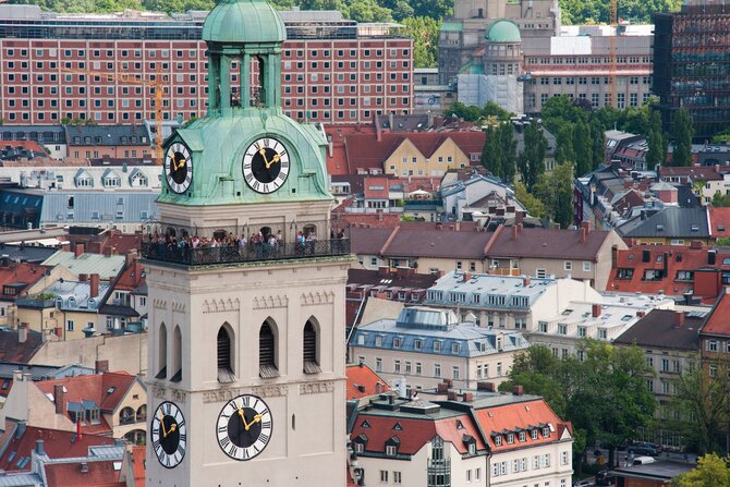 Già prima della fondazione della città, sul Petersberg sorgeva una piccola cappella, che all'inizio dell'XI secolo fu sostituita dall'edificio di fondazione romanica della chiesa di San Pietro. Nel XIII secolo fu eretto un nuovo edificio gotico, che nel corso del tempo è stato più volte ricostruito e modificato stilisticamente. Durante la seconda guerra mondiale la chiesa fu talmente danneggiata che la ricostruzione durò fino al 1975. La torre rinascimentale "Alter Peter" è considerata un punto di riferimento della città, insieme alla torri Frauentürme. Salendo 302 gradini di legno all'interno si raggiunge la galleria panoramica, da dove si può godere di una splendida vista su Monaco. Nella tanto frequentata e leggendaria chiesa ci sono molti tesori d'arte di diverse epoche come l'altare gotico di Schrenk, il fonte battesimale barocco di Kumpur o gli altari laterali di Ignatz Günther del periodo rococò.