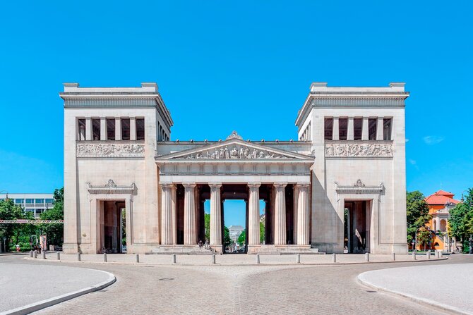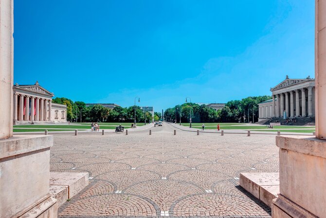 Re Ludwig I fece costruire tra il 1817 e il 1862 dal suo architetto Leo von Klenze la piazza neoclassica con la Glyptothek a nord in stile corinzio e la Collezione Statale di Antichità Classiche a sud in stile ionico. I propilei ad ovest in stile dorico sono modellati in base alla porta dell'Acropoli di Atene. La Königsplatz ricorda la lotta greca per la libertà (1821-1829). Così, nell' "Isar-Atene" di Re Ludwig I, è stato creato un magnifico quartiere di templi per l'arte. I nazionalsocialisti hanno pavimentato la piazza, che in precedenza era stata coperta di prato, per utilizzarla per le marce e le riunioni del NSDAP. Un monumento eretto ad est alle vittime del colpo di stato del 1923 fu fatto saltare di nuovo in aria nel 1945. In seguito la piazza è servita come parcheggio fino a quando non è stata finalmente rinverdita nel 1988. Oggi, d'estate, qui si svolgono grandi concerti, opere liriche e proiezioni di cinema all'aperto sullo sfondo magnifico della piazza.