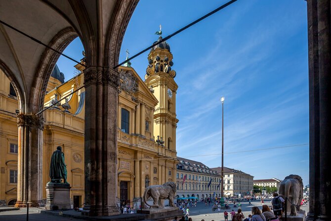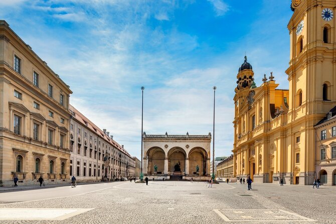 La maestosa piazza costituisce il punto di partenza della magnifica Ludwigstrasse, che il re Ludwig I fece costruire da Leo von Klenze nel 1816 come Via delle Scienze. L'Odeonsplatz è incorniciata dalla Theatinerkirche, dal Leuchtenberg-Palais, dall'Odeon, dall'Hofgarten, dalla Residenz e dalla Feldherrnhalle. A tal proposito, il monumento equestre a Ludwig I fu eretto solo nel 1848, dopo che egli dovette abdicare a causa della vicenda Lola-Montez. L'Odeonsplatz divenne tristemente famosa durante il colpo di stato di Hitler, che qui si concluse in modo sanguinoso nel 1923.
