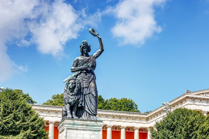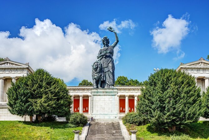 Il re Ludovico I commissionò la statua alta 18 metri, che doveva irradiare la forza bavarese e tedesca in stile romano. Basato su un progetto dello scultore Ludwig Schwanthaler, è stato realizzato con 1500 quintali di minerale proveniente da cannoni da battaglia affondati in mare e fuso da Ferdinand von Miller tra il 1844 e il 1850. Il risultato è una magnifica donna germanica con una ghirlanda di Gloria nella mano sinistra e un leone al guinzaglio nella destra. All'interno, una scala a chiocciola porta in cima. Da qui si ha una vista meravigliosa sul Wiesn e sulla città. Sempre su commissione del re Ludovico I, Leo von Klenze costruì tra il 1843 e il 1853, su una collina sopra il Theresienwiese, la sala dorica a tre ali con colonne di marmo. La Hall of Fame ospita i busti di importanti bavaresi e incornicia la scultura monumentale della Baviera.
